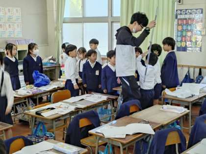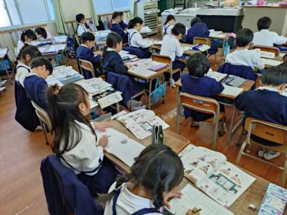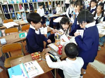 1年生は家からいろいろな箱を持ち寄り、その特徴を比べたり、高く積み上げたり、高さ比べをしたりしている学級もありました。サイコロのような箱を持ってきた児童もいました。それぞれの特徴をとらえて、仲間わけができるかな。