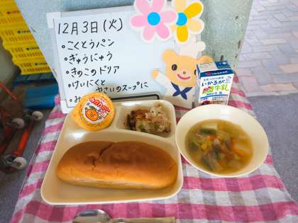 今日の給食は、黒糖パン、牛乳、きのこのドリア、鶏肉と野菜のスープ煮、みかんゼリーです。
