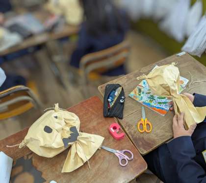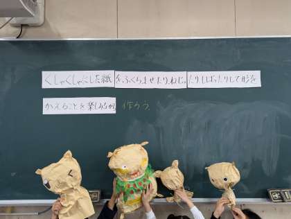 2年生は、作品展の練習で大きな筒状の紙を使って形作りをしています。