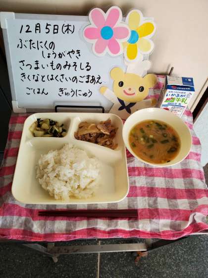 給食は、ごはん、牛乳、豚肉のしょうが焼き、さつまいものみそ汁、きくなと白菜のごまあえです。