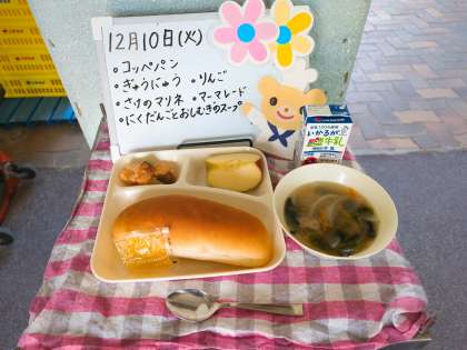 給食は、コッペパン、牛乳、さけのマリネ、肉団子と押し麦のスープ、りんご、マーマレードです。