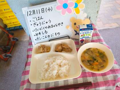 給食は、ごはん、牛乳、鶏肉の甘辛焼き、みそ汁、だいこんの煮物です。