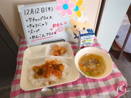 給食は、ケチャップライス、牛乳、スープ、れんこんフライです。