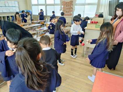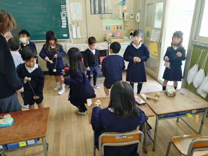 1年生の教室に行くと、けん玉やヨーヨーの練習をしていました。なかなかうまい子もいました。2月の中旬には、保幼小交流会を開き、保育所や幼稚園の人を学校の講堂に呼んで、遊びを通して交流します。上手になって、一つ年齢が下のお友だちに教えてあげないといけませんから、頑張って練習しましょう。
