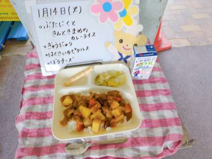 豚肉と金時豆のカレーライス、牛乳、白菜のピクルス、棒チーズです。