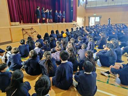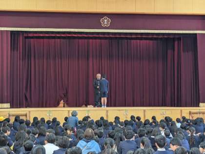 今日は木曜日なので、児童集会がありました。10名くらいの集会委員会の人が講堂の壇上に立ち、「聖徳太子ゲーム」を進めてくれました。これは、3人の人が同時に違う言葉を叫んで、それをつなぎ合わせるとなんという言葉になるのかを当てるゲームです。例えば、「ね」「め」「が」で、「めがね」になります。しかし同時に言うと全くわかりませんでした。。