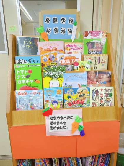給食週間では、普段なにげなく食べている給食について改めて考える期間となっています。そこで、給食に関係する本のブースを図書室に設けました。ぜひ、この機会に給食に関係する本を手に取り給食の意義や役割を理解し、給食についての関心を高めてほしいと思います。