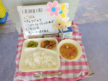 今日の給食は、ごはん、牛乳、さばのカレー竜田揚げ、五目汁、きゅうりの甘酢和えです。