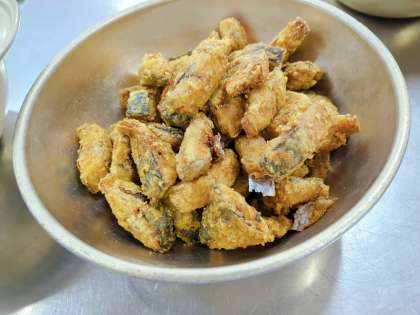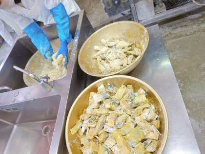 今日の給食では、「さばのカレー竜田揚げ」に使用しています。さばにしょうが汁、料理酒、こいくちしょうゆ、カレー粉で下味をつけでん粉をまぶしてから油で揚げました。1人2こずつでした。