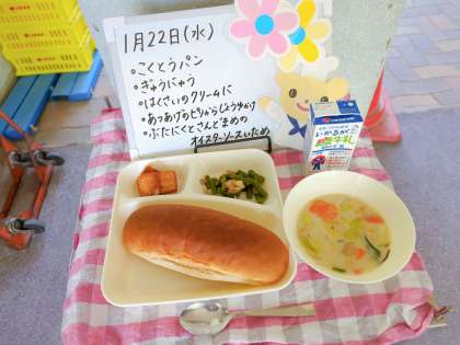 今日の給食は、黒糖パン、牛乳、白菜のクリーム煮、厚揚げのピリからじょうゆかけ、豚肉と三度豆のオイスターソースいためです。