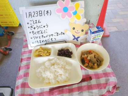 今日の給食は、ごはん、牛乳、筑前煮、ツナとキャベツのごまいため、黒豆の煮物です。