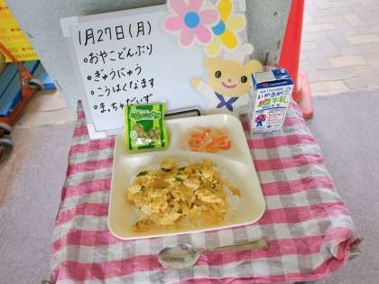 今日の給食は、親子丼、牛乳、紅白なます、抹茶大豆です。