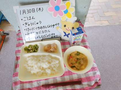 今日の給食は、ごはん、牛乳、鶏肉のおろしじょうゆかけ、水菜の煮びたし、一口がんもとじゃがいものみそ煮です。