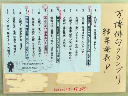 その作品は、「初桜 万博開幕 皆行こか」です。4月17日開幕に合わせて春が来て桜が咲き、大阪弁で「ほな、いこか!」という響きがとっても大阪らしいです。こんど、あべのハルカスで表彰式があるそうです。おめでとうございます。