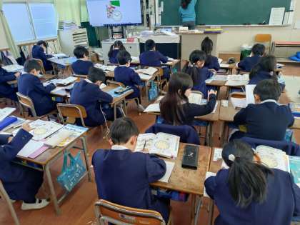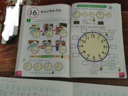 1年生の算数は、今日から「時計」の単元に入りました。デジタル時計が多くなっている中、アナログ時計の学習になります。1年生では、個の単元がよく理解できない児童が見られます。そのわけは、10進法と12進法が出てくるのと、短針は12時間で360度回転するから1時間は30度。つまり、3時間で90度になること。長針は1時間(60分)で360度回転するから、15分で90度回ることを理解しないといけないので、こんがらがってしまいます。(もちろん角度は4年生の学習内容ですので、時計があらわしている時間を読み取るのにその概念を使います。例えば、10時10分の短針と長針の位置を書き入れる問題がそのような内容です)しっかり考えましょうね。
