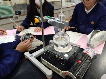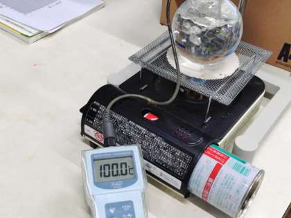 今日はガスコンロで水を温めて出てくるアワの様子や、デジタル温度計や棒温度計ででその時の水の温度を測っていました。