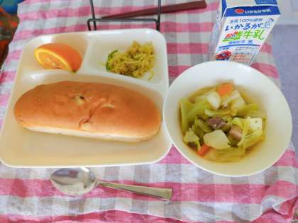 今日の給食は、レーズンパン、牛乳、ポトフ、カレーソテー、いよかんです。