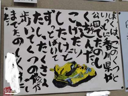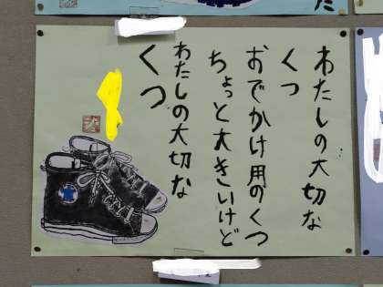 5年生の靴の絵です。相田みつお風に崩した文字で思いも書き入れました。味がありますね。