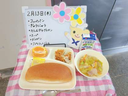 今日の給食は、コッペパン、牛乳、押し麦のグラタン、スープ、デコポン、アプリコットジャムです。