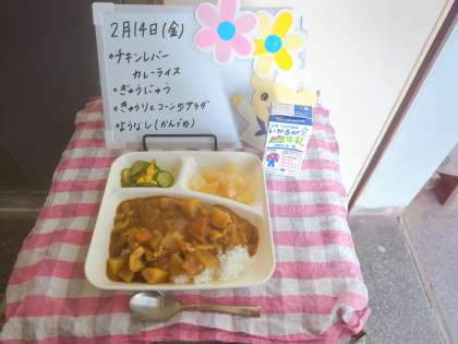 今日の給食は、チキンレバーカレーライス、牛乳、きゅうりとコーンのサラダ、洋なし(缶詰)です。