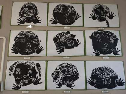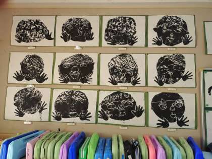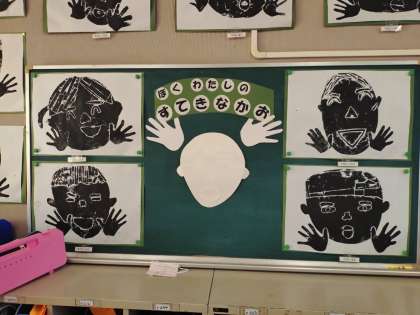1年生の版画が乾き、背面黒板いっぱいに張り出されました。迫力満点です。