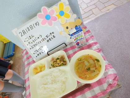今日の給食は、ごはん、牛乳、豚肉と干しずいきのみそ煮、五目汁、焼きじゃがです。