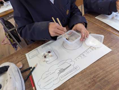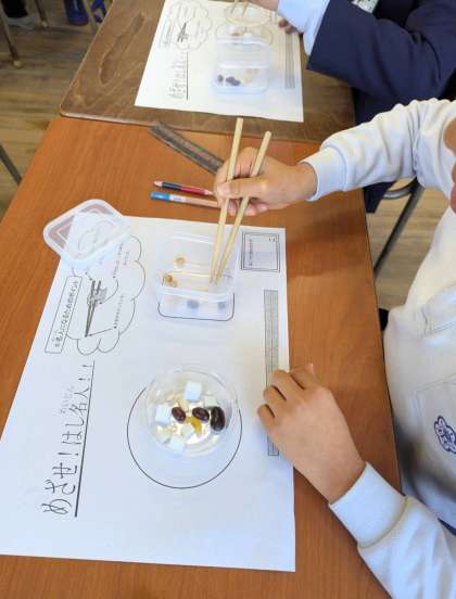 3年生で「食事のマナーを考えよう」というテーマで栄養教諭と一緒に学習しました。