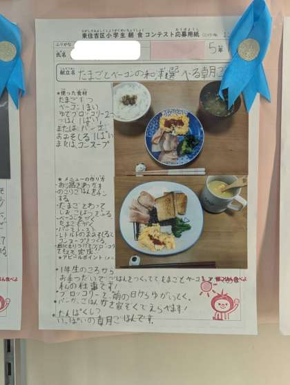 東住吉区小学生朝食コンテストに応募した児童のうち本校5年生の献立が入賞いたしました。アイデア賞です★入賞作品が掲示されています。