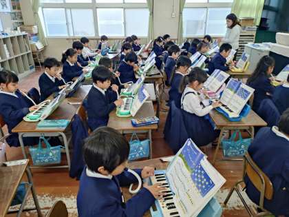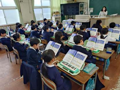 1年生の教室から、鍵盤ハーモニカの合奏が聞こえてきました。「きらきらぼし」を演奏していました。大音量です。