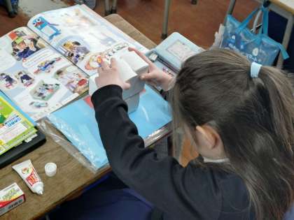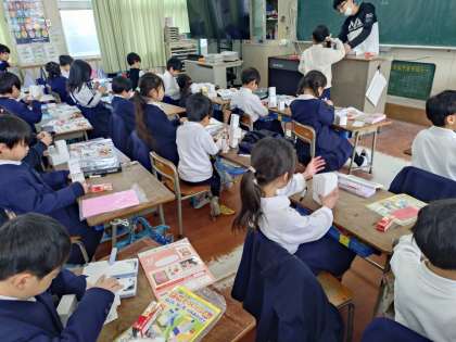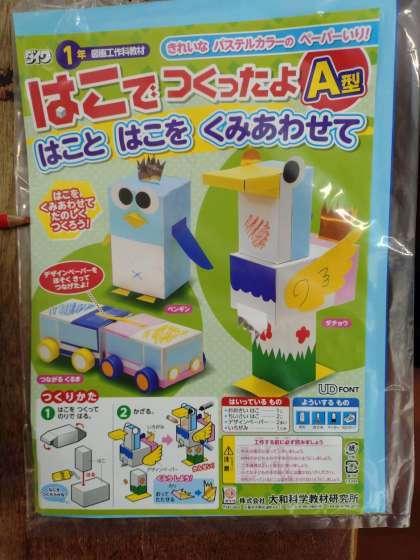一年生は固い紙から箱を作り、それを組み合わせながらいろいろなものを作っていました。これからペンギンや自動車などになるのでしょうか?