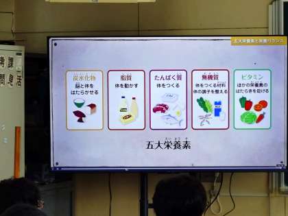 栄養指導では、今まで「赤、黄、緑」の食べ物という言葉で学習を進めてきましたが、6年生では、ビタミンやカロチンなどの言葉を学習してきているので、「五大栄養素」として整理して学習しています。炭水化物、脂質(脂肪)、タンパク質、無機質、ビタミンです。それぞれどんな食べ物に含まれているかについてまとめていました。また、その栄養素はどんな働きがあるのかについても学習していました。