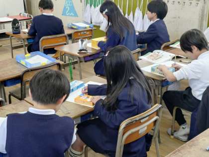 2年生は算数で立体の学習をしています。家から持ってきた箱を取り出して、面の形を紙に写し取って、面の形が長方形、正方形という学習をしていました。4年生で、これが直方体、立方体という言葉に代わっていきます。この「箱のかたちをしらべよう」が算数の最後の単元で、あとは2年生の復習に入ります。