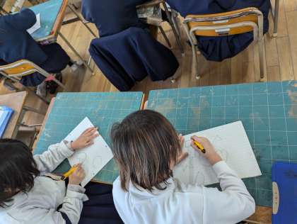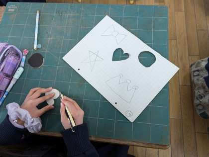 初めて使うカッターにドキドキしながら、ルールを守って活動しています。ボール紙に模様を描き、ゆっくり少しずつ切りました。一回では切り取れず、何度か同じ所を切っている子もいました。