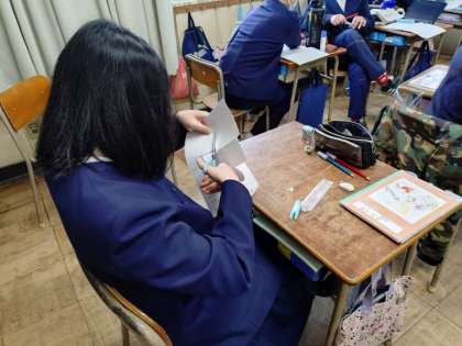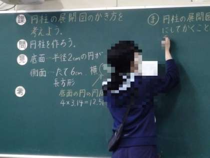 5年生の算数も、最終単元の立体を学習しています。角錐や角柱、円柱などの学習です。今日は展開図を書いて、実際に工作用紙で展開図を書き、表面積を求めていました。