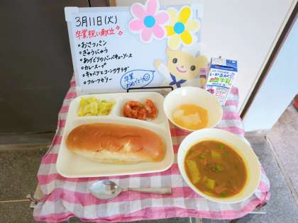 今日の給食は、卒業祝い献立です。メニューは、おさつパン、牛乳、あげどりのバーベキューソース、カレースープ、キャベツとコーンのサラダ、フルーツゼリーです。