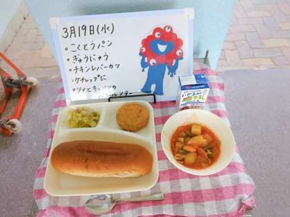 今日の給食は、黒糖パン、牛乳、チキンレバーカツ、ケチャップ煮、ツナとキャベツのバジルソテーです。