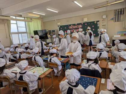 1年生は、初めての給食当番です。