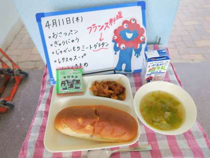 今日の給食は、おさつパン、牛乳、じゃがいものミートグラタン、レタスのスープ、ソフト黒豆です。