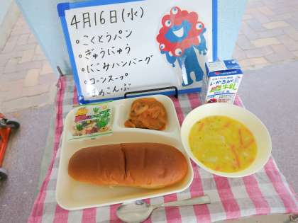 今日の給食は、黒糖パン、牛乳、煮込みハンバーグ、コーンスープ、豆こんぶです。