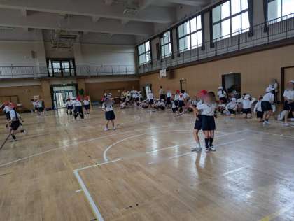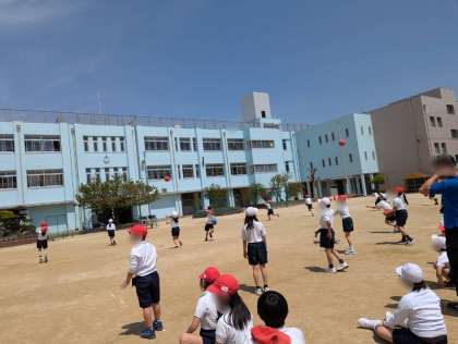 体育では、学年体育をしました。チームのメンバーのサポートをしたり応援したりと大盛りあがりでした。