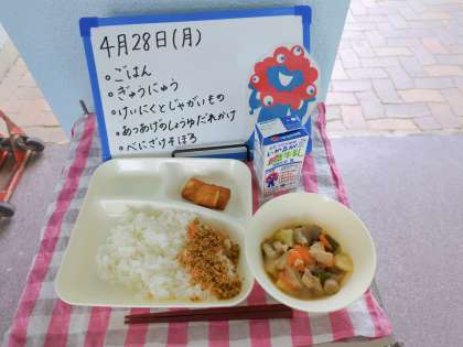 今日の給食は、ごはん、牛乳、鶏肉とじゃがいもの煮物、厚揚げのしょうゆだれかけ、紅ざけそぼろです。