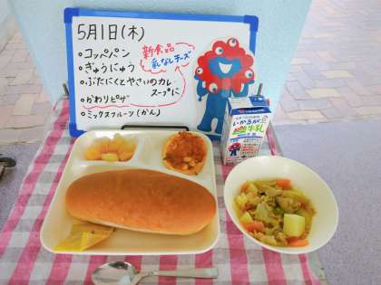 今日の給食は、コッペパン、牛乳、豚肉と野菜のカレースープ煮、変わりピザ、ミックスフルーツ(缶)です。