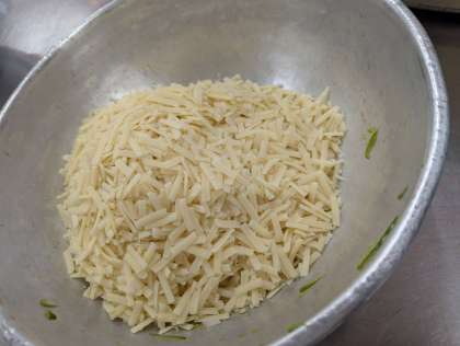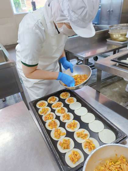 給食の変わりピザは、ぎょうざの皮に新食品の「乳なしチーズ」とツナ、コーン、ピーマン、ピザソースを混ぜ合わせた具をのせ、焼き物機で焼いています。