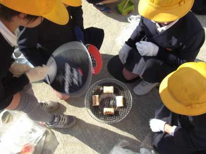 三年生は、社会で学習した「昔の道具(七輪)」を使って、おもち焼き体験をしました。