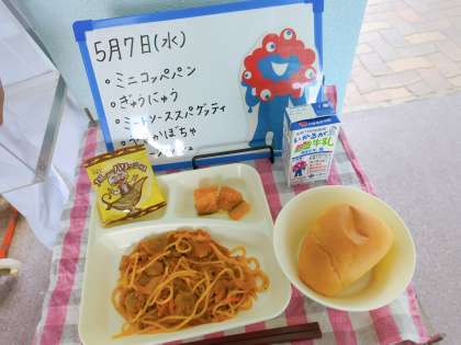 今日の給食は、ミニコッペパン、牛乳、ミートソーススパゲッティ、焼きかぼちゃ、カレーフィッシュです。