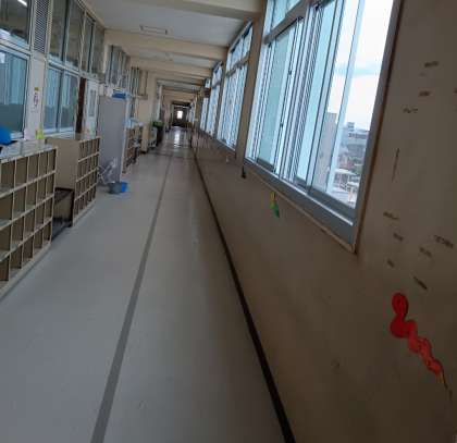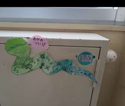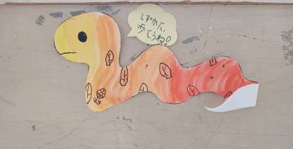 5年生の前の廊下を歩いていると、きれいにグラデーションされたへびが掲示されています。
