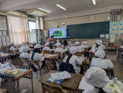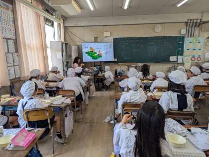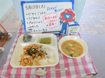 教室では、新茶の季節に合わせて抹茶ういろうが出ていることを紹介しました。「抹茶すき!(3年生)」「おみそ汁落ち着く味〜(2年生)」「かやくご飯おいしい(1年生)」と児童に好評でした。