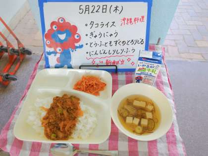 今日の給食は、タコライス、牛乳、豆腐ともずくのとろり汁、にんじんしりしり風です。