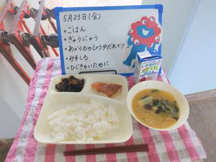 今日の給食は、ごはん、牛乳、赤魚のしょうゆだれかけ、みそ汁、ひじきの炒め煮です。