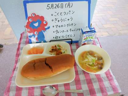 今日の給食は、黒糖パン、牛乳、マカロニグラタン、ウインナーとキャベツのスープ、みかん(缶)です。